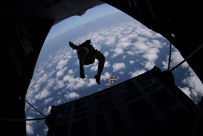 Soilders jumping from fighter plane